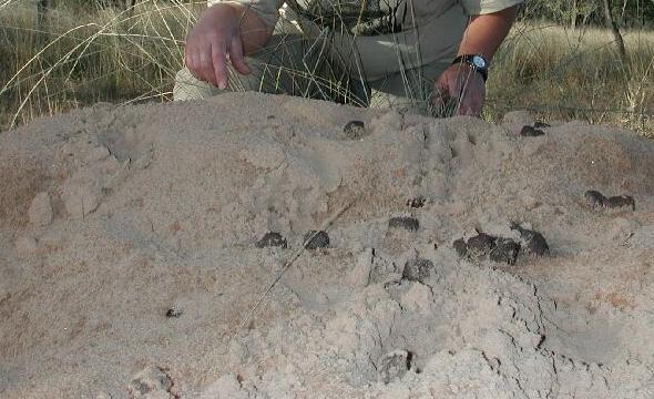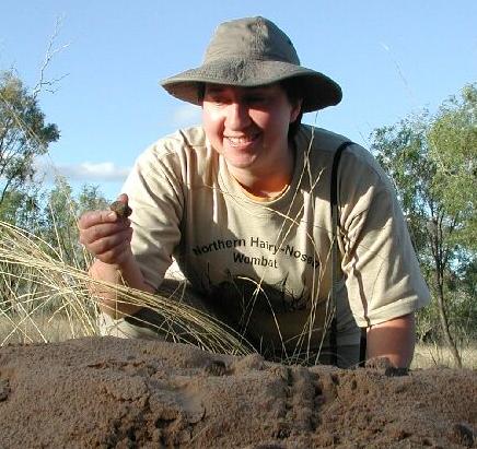Me at a wombat burrow wearing my Northern Hairy-Nosed Wombat T-shirt and holding a wombat poo