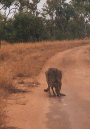 An Epping kangaroo at dusk drinking from a rain puddle